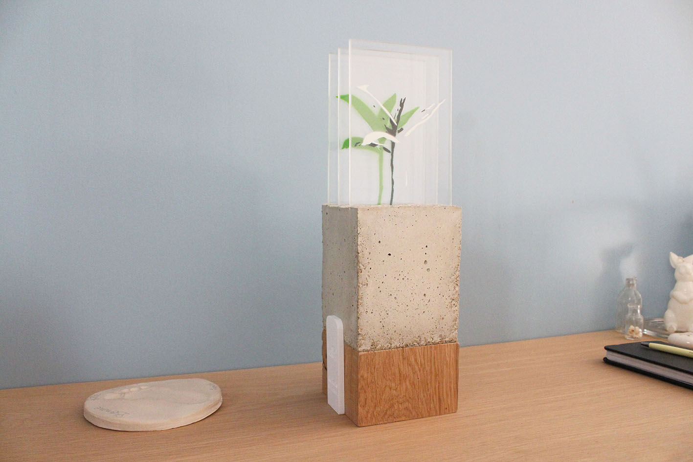 Réalisée à partir d’un assemblage de bois et de béton, elle met en scène la dureté et la rigidité des matériaux issus de la construction humaine, opposées à la fragilité organique d’une pousse végétale.